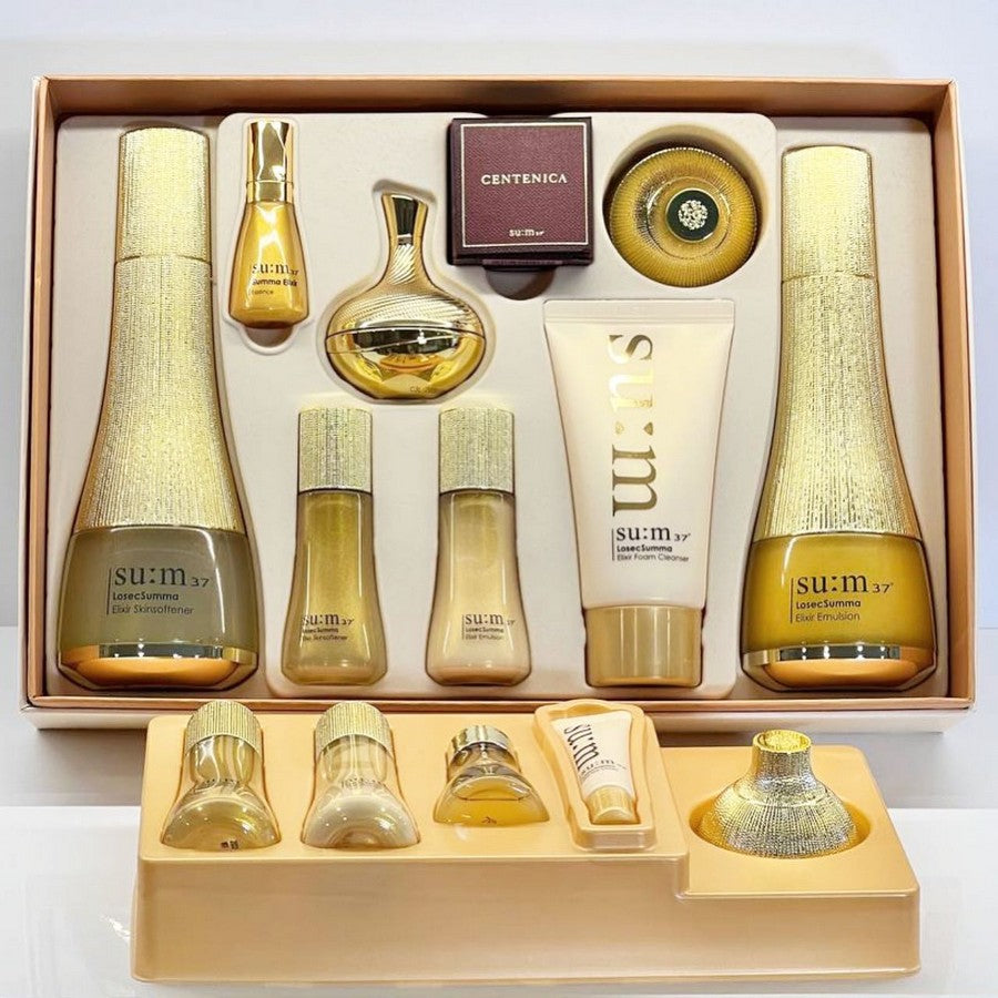 A collection set of the su:m37° Losec Summa premium anti-aging line. The Losec Summa line is formulated with pure Gold, 18 herbal ingredients and Cytosis, which consists of 80 different types of naturally fermented plants that produce bioenergy to restore elasticity and regenerate damaged skin.